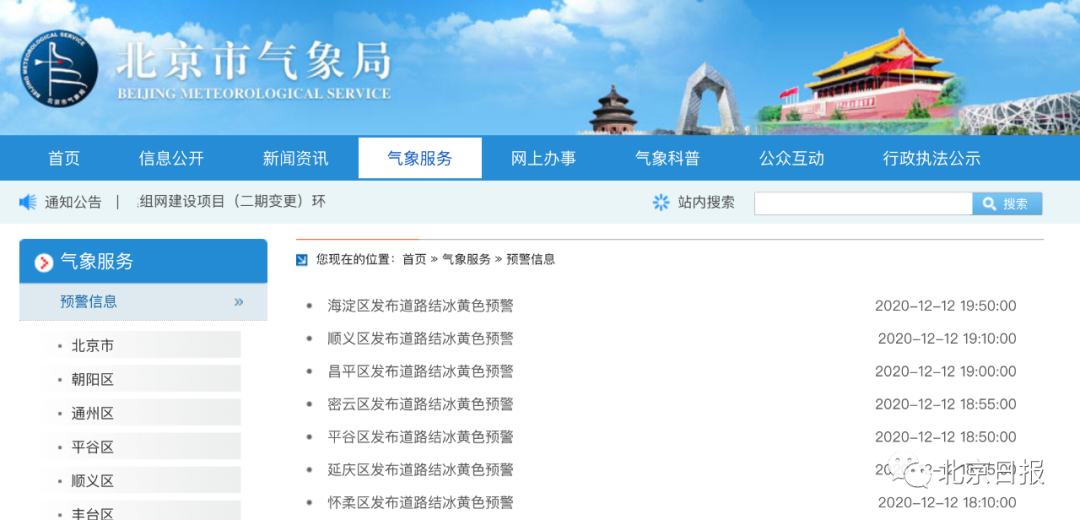 昨晚6时开始,北部六区怀柔、延庆、平谷、密云、昌平、顺义先后发布了道路结冰黄色预警。晚8时海淀区也发布了道路结冰黄色预警。