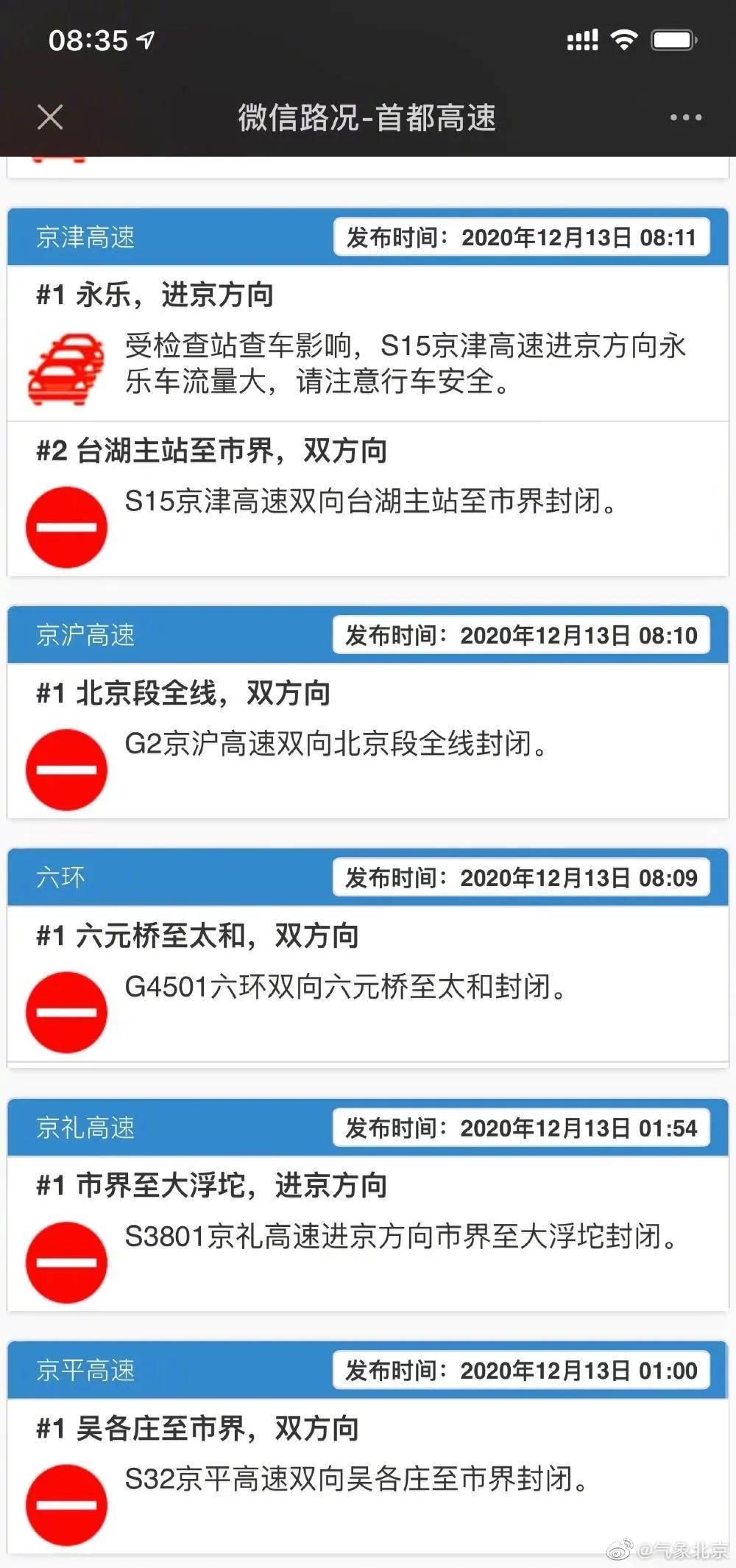此外,受降雪天气影响,京津、京沪、六环、京礼、京平部分高速路段采取临时封闭措施,出行请关注路况信息。