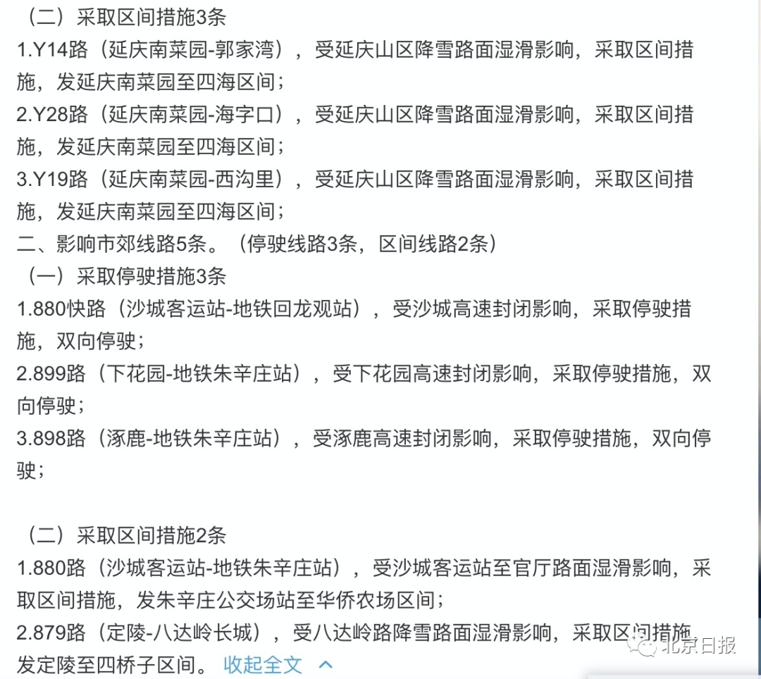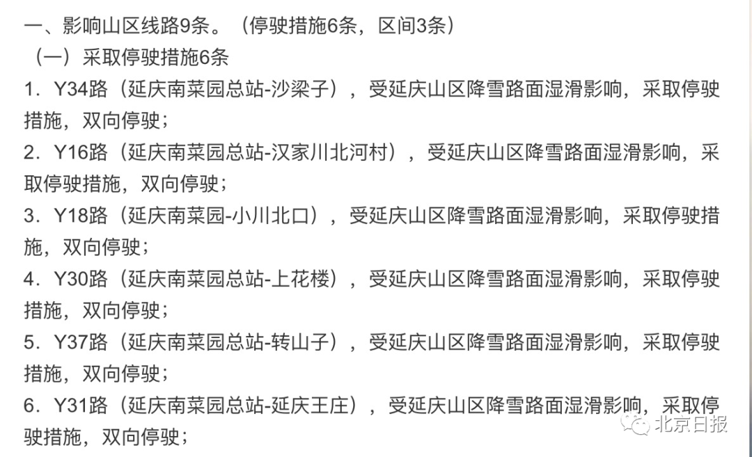 受降雪影响,14条公交线采取区间、停驶措施,其中市郊线路5条,山区线路9条,具体线路及措施如下图。