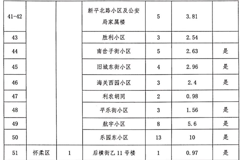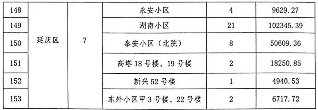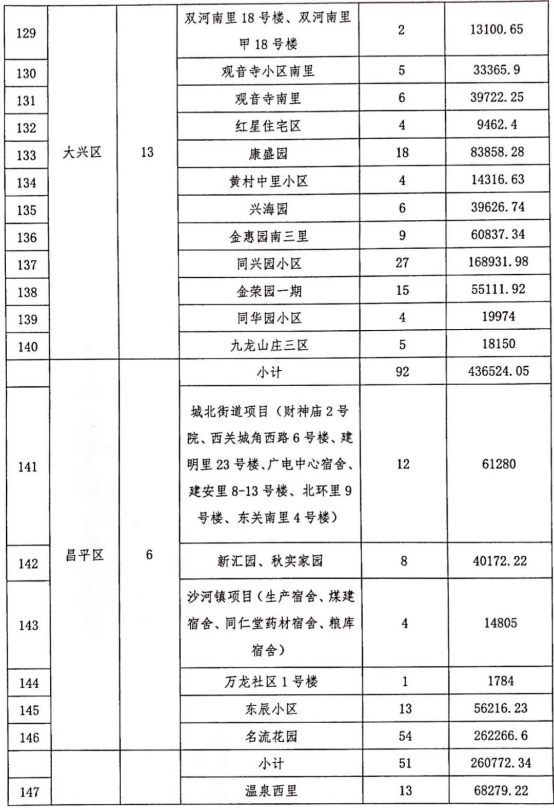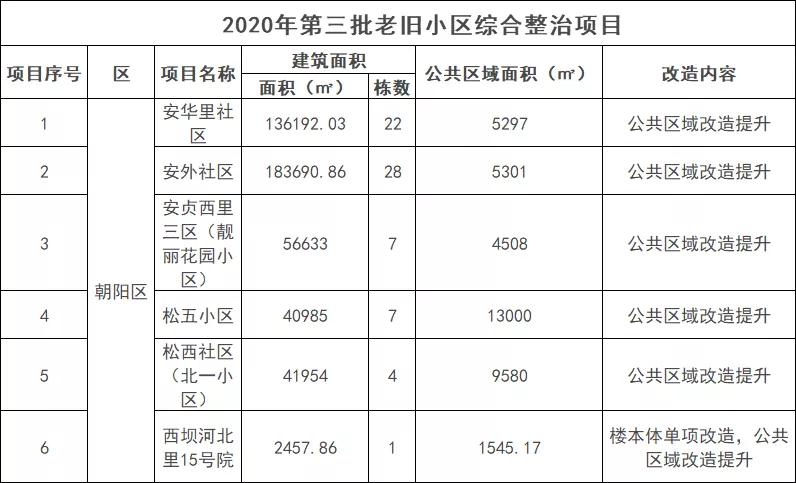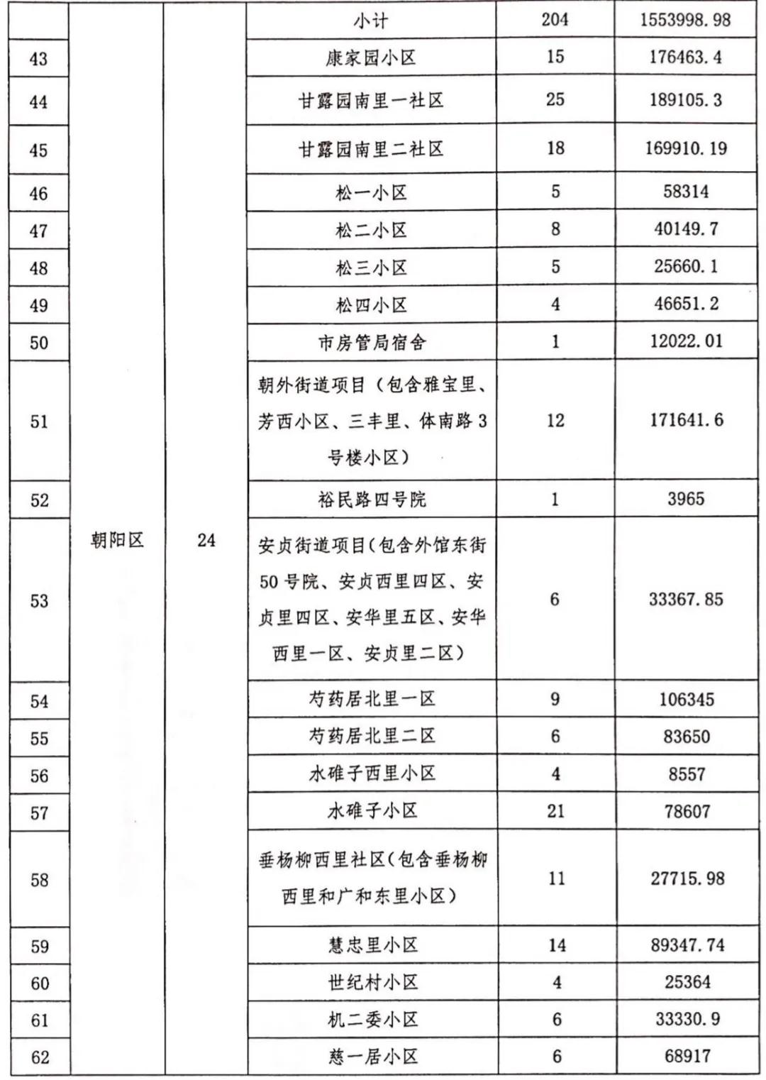 全部是朝阳区的小区,这批确认的名单全部是朝阳区的小区为安华里社区、安外社区、安贞西里三区(靓丽花园小区)、松五小区、松西社区(北一小区)、西坝河北里15号院6个小区,共涉及69个楼栋,建筑面积约46.2万平方米。