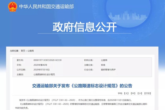 对此,国家交通运输部6月底发布《公路限速标志设计规范》,详细规定了公路限速路段划分、限速值论证、限速方式选取等内容,并将自2020年11月1日起施行。