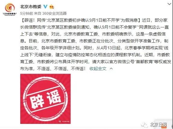 关于北京市中小学生开学的谣言屡禁不止。近日,部分家长微信群又开始流传“北京某区教委接到通知,确认9月1日前不会复学”“网课就这么一直上下去”等信息,对此,北京市委教育工委、市教委明确表示,这是一条虚假信息。