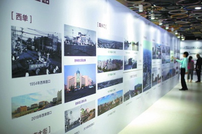 “长安街是北京市区的东西轴线。新中国成立后,以天安门为中心不断规划、完善长安街,其范围东起建国门西至复兴门,成为首都的中心。从上至下,大家看到的这四幅立面长卷分别是1953年西单到府右街路北的街景,1955年长安街拓宽改造后西单至东单路北、路南的街景,以及2003年后长安街的新貌。”在市城市建设档案馆工作人员的指引下,观众可以在珍贵的老照片中看到上世纪50年代有轨电车的交通亭、洗染工厂、国营电器零售店等具有时代特色的建筑设施和街道上熙熙攘攘的人流。
