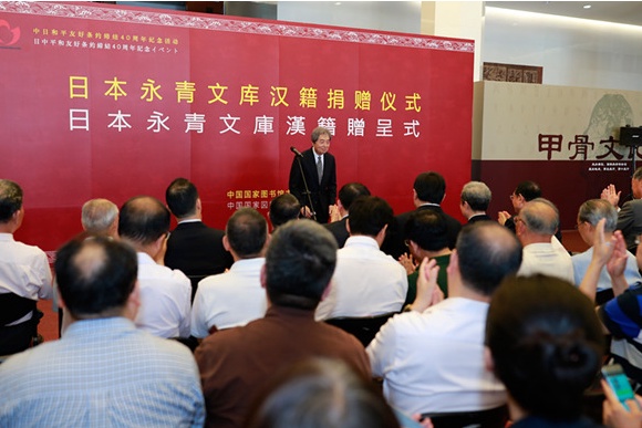 会上,雒树刚在致辞中感谢细川护熙长期以来致力于中日友好事业,赞赏永青文库在中日和平友好条约缔结40周年之际,将细川家族数代人收藏的36部、4175册珍贵汉籍无偿赠予中国国家图书馆,表示该义举将为新时期中日文化交流与合作发挥示范和推动作用。
