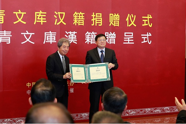 捐赠仪式上,国家图书馆馆长韩永进代表国家图书馆向细川护熙颁发捐赠证书。为配合此次捐赠,国家图书馆专门策划《书卷为媒友谊长青——日本永青文库捐赠汉籍入藏中国国家图书馆展》,将面向公众展一个月。捐赠仪式前,雒树刚部长在国家图书馆会见了细川护熙一行,并见证永青文库和国家图书馆签署汉籍捐赠仪式。