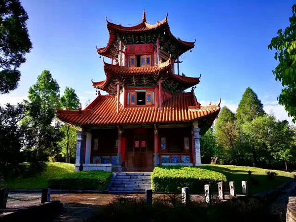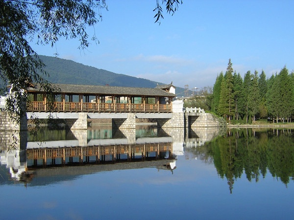 进入景区壮族村,迎面有祭祀龙王的龙柱,两边是先民绘制的天王崖画和为纪念传说洪水泛滥时帮助先民度过劫难而建的石葫芦亭。祭祀玉皇大帝的昊天阁和传说能驱邪纳福的硕大铜鼓耸立在广场两侧。杆栏式和麻栏式民居、壮族青年社交休憩的“情廊”、村寨长老议事的“老人亭”,及龙树和“三七”园分布其间。稍远处别致的风雨桥和旋转的水车,映衬出一派秀丽的壮乡田园风光。