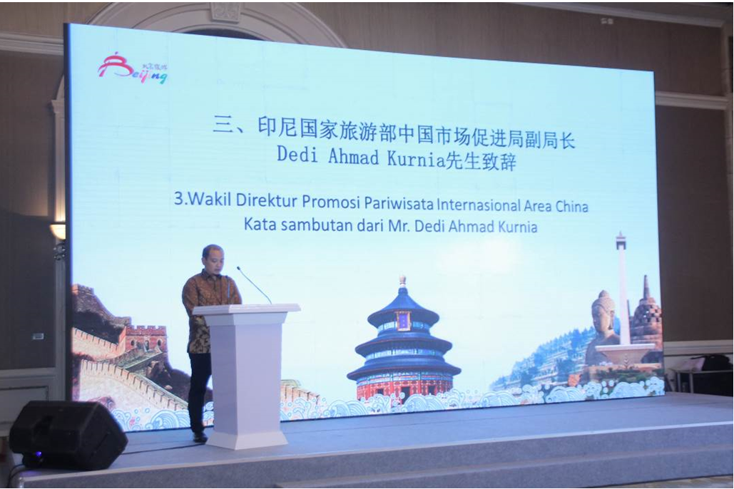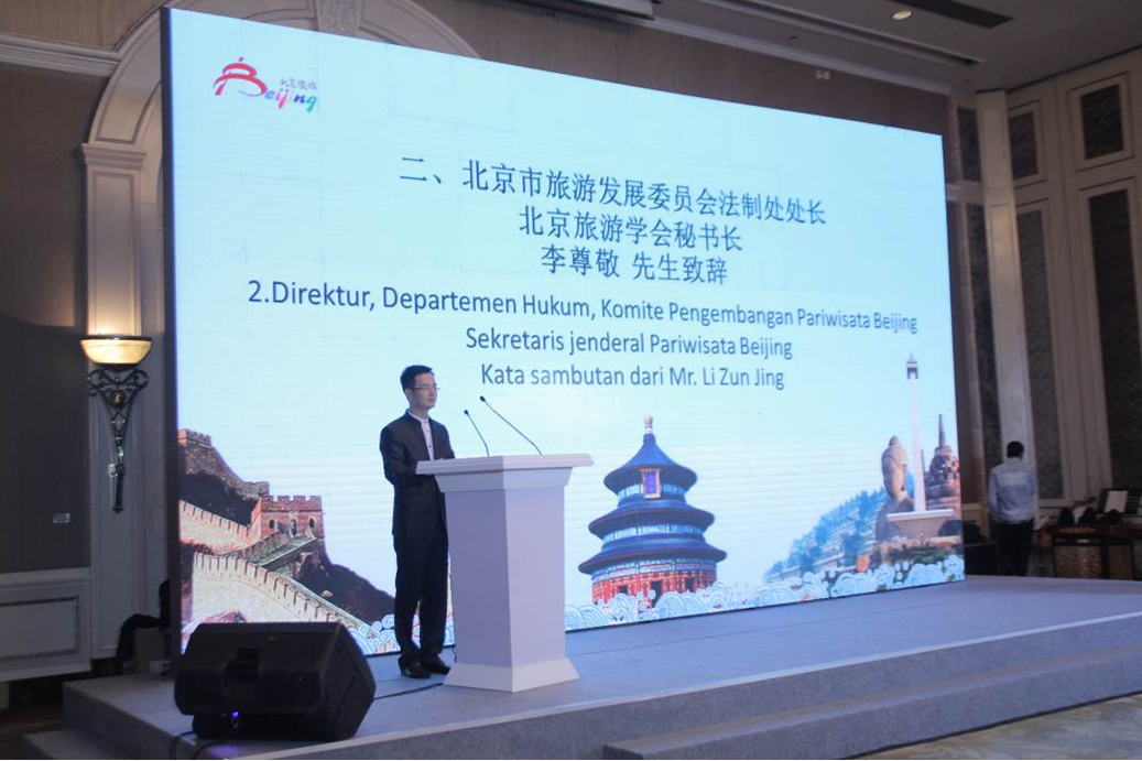 北京市旅游发展委员会法制处处长、北京旅游学会秘书长李尊敬在致辞中表示,印尼是东盟重要成员国,也是“一带一路”21世纪海上丝绸之路的重要国家,两国间的交流与合作日益密切。特别是在旅游方面,近年来,印尼的旅游业发展形势良好,已经成为中国游客喜欢的旅游目的地之一。同时,北京接待印尼游客人数同比增长17.6%。今天我们希望藉此契机推介北京旅游资源,深化两国的旅游合作、让更多的印尼人民了解中国,了解北京;并进一步拓展北京在印尼旅游市场的影响力。