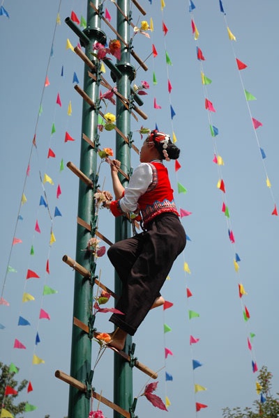 广场上,人们身穿节日盛装举办各种充满傈僳风情的特色活动。傈僳族的姑娘们头戴“俄勒”头饰,身着长裙,有一种雍容华贵之美。傈僳族的勇士们头戴黑色包头,左腰佩戴砍刀,右腰挂箭包,身姿轻盈矫健。上刀杆是傈僳族一项惊险刺激的表演,二十多米高的刀杆立于天地间。所谓刀杆是木架上结结实实捆绑着几十把磨得锋利雪亮的钢刀,刀口一律朝上。傈僳族的勇士们赤足徒手,身轻如燕,在毫无保险的情况下,双脚踩刀,爬上刀杆。在刀杆顶,勇士们面向天空,与神对话,祈求神灵庇佑。