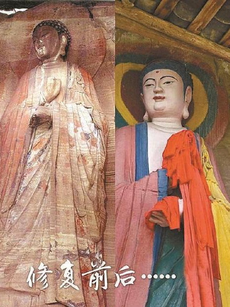 在网友曝光的峰门寺石刻大佛修复前后对比图中可以看到,该佛像在修复前已有色彩剥落,但除右掌断掉,其余部位没有明显损坏。而修复后的佛像全身覆盖鲜艳的红、蓝、黄、绿等颜料,看起来像是被化了浓妆。