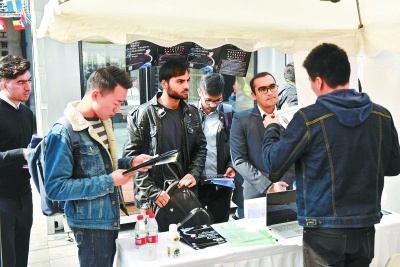 昨天,作为双创活动周的重点活动之一,2018国际创新集市在中关村创业大街举办,近20家国内外知名企业摆摊设点,吸引众多国内外人才前来投递简历和交流。 本报记者 和冠欣摄