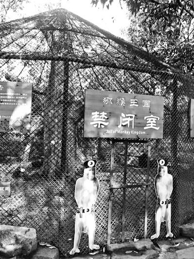 这组走红网络的照片,拍摄于海南南湾猴岛风景区。北青报记者从照片中看到,猴山内有部分猴子被关在笼子里,并在笼子上挂上了“抢劫罪拘留15天”“过失伤人刑事拘留10天”“故意伤害罪刑事拘留一个月”的牌子。