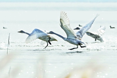 11月7日,成群天鹅、灰鹤、赤麻鸭等候鸟在怀来县官厅水库栖息、戏水。近年来,该县加大生态建设力度,有效改善了生态环境。官厅水库成为多种鸟类南北迁徙中的栖息地。张家口日报记者 武殿森 通讯员 孙慧军摄