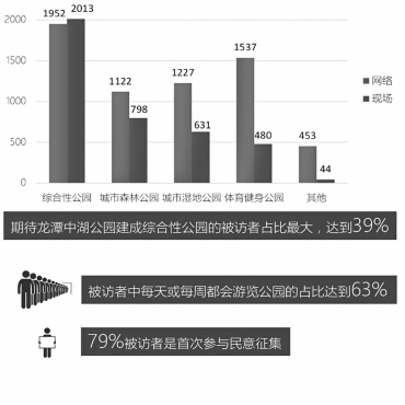 今年10月15日,东城区启动了龙潭中湖环境整治提升景观规划民意征集活动,截至10月24日24时,共有12.1万人次关注了本次民意征集活动,有2.15万人次实际登录答题平台和来到征集现场,共收集有效调查问卷超过1万份。从统计的数据来看,期盼龙潭中湖公园建成综合性公园的被访者占四成;被访者希望龙潭中湖公园具备功能为休憩、娱乐、健身和教育科普;超过七成被访者距龙潭中湖公园3公里以内;六成的被访者每天或者每周都会游览公园;近八成的被访者是首次参与民意征集。其他的建议中,希望公园尽快完成建设并开放和建成后公园免费开放的意见比较集中。
