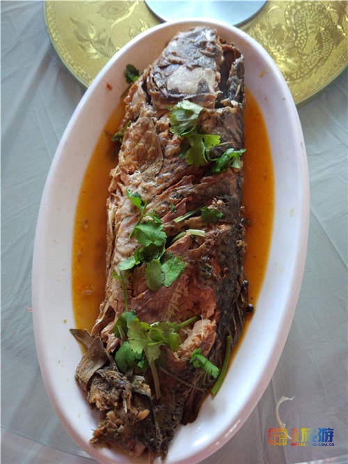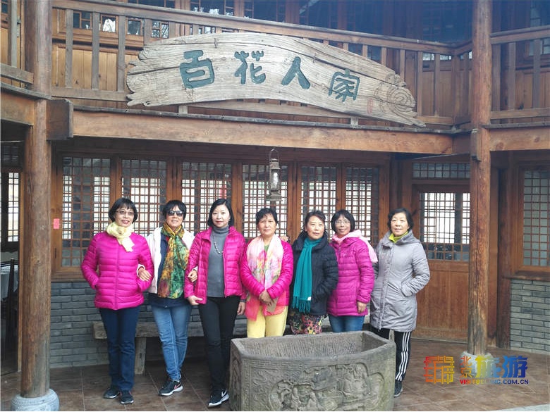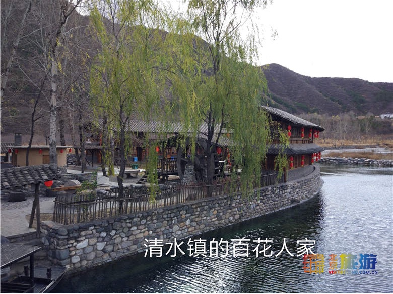中午,来到镇上号称京城农家饭第一家的百花人家清水老店,古色古香的农家大院,环境以大自然为背景,一湾绿水绕人家,杨柳轻摇荡水波,参天的大树下旁边是古朴的大石臼,池塘,风车,马车,磨盘……有种世外桃源的感觉。菜品味道也有特色,我点了垂涎很久的猪头压肉和跨炖鱼,徐瑛点了炸油香和黄米炸糕,别人又点了砂锅豆腐丸子、酸菜炖肉、山蘑炒土豆丝、娃娃菜、摊柴鸡蛋、羊肉等等,同学们胃口大开,上一盘光一盘,最后上的羊肉剩下了。算钱结账,人均42元。还真不愧是农家菜的翘楚。