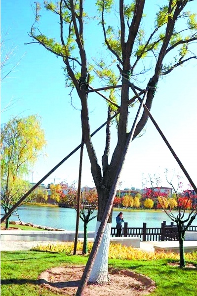 目前,几棵树形好、长势好、树龄在40年左右的国槐已经被移植到西海子公园里面,高高的枝头与蓝天和周边的亭台楼阁、湖水、远处的燃灯塔形成一幅美丽的图画。“我们本着和西海子公园景观一致的原则,到广渠路挑选了这几棵国槐树。全冠移植后,还给它们的根部注射了栽植生根粉,再加上注射抗蒸腾剂,减少树根蒸发量。日常维护时,专业技术人员也是随时关注这些新来的‘搬迁户’,一直坚持给它们补充营养液,目前看起来长势还不错。”西海子公园工程监理告诉记者,秋末冬初是树木移植最好的时段。树叶落了后,养分回到根部,更利于树木成长。“作为园林绿化工作者,我们对一草一木都有着深厚的感情,我们会像爱护自己的孩子一样,爱护西海子公园的环境,更精细地照看这些‘新成员’。” 王军志摄