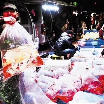 春节越来越近了,逛花鸟鱼虫市场的人流逐渐升温。特别是观赏鱼夜市更是火爆,人们竞相选购红鹦鹉、锦鲤、金鱼等观赏鱼,期盼连年有余。本报记者 尉迟健平摄
