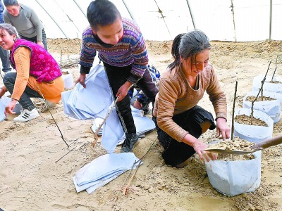 在另一座大棚里,六七个村民正在栽种树苗。热依汗古丽·木吉比丁一家4口人,靠老公在建筑工地打零工生活,是村里的贫困户。去年11月开始,她到平洛心意公司的大棚里干活,每月可挣2100元,日子比以前“好多了”。
