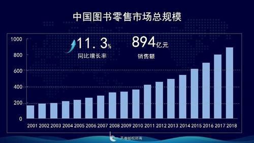 据《全球背景下的中国图书零售市场》显示,2018年中国图书零售市场码洋规模达894亿,相较去年同比上升11.3%,继续保持两位数的增长。