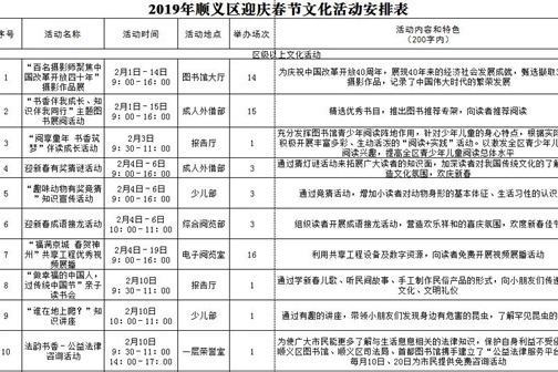 区影剧院、区文化馆、区图书馆等场所推出新春音乐会、贺新春传统戏曲艺术节、顺义区非物质文化遗产展销展演、书香伴我过大年等活动。特别是在焦庄户地道战遗址纪念馆、区档案馆等区内爱国主义教育基地,将举办红歌大赛、红色诗歌朗诵等多样文化活动。