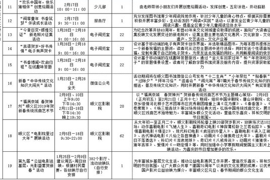 各基层单位,依据实际情况,举办春节、元宵节特色活动,组织发动群众文艺团队开展花会、秧歌会、元宵灯会、舞龙舞狮等群众性文化活动。举办顺义区第十七届“赵全营杯”民间花会大赛暨京津冀三地民间花会交流展演,北务镇“龙腾狮跃闹元宵”舞龙大赛等。各镇街分别举办“二月新春”文化活动汇演,为辖区居民奉上歌舞、相声等丰富多彩的文化大餐。