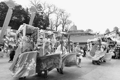 在第六届八大处新春祈福庙会上,来自丰台区石榴庄双庙村的村民进行民间旱船表演。庙会期间,过福桥、点福烛、品福茶、吃福糕、打金钱眼、品美食等各项活动展现了浓浓的老北京风情。本报特约摄影 李文明