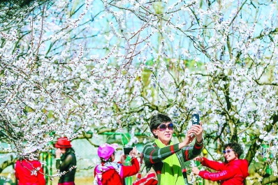 连日来京城天气晴好,天坛公园北门西侧附近的杏林花朵竞相开放,层层密密如雪落枝头,吸引不少游客来此赏景留影。