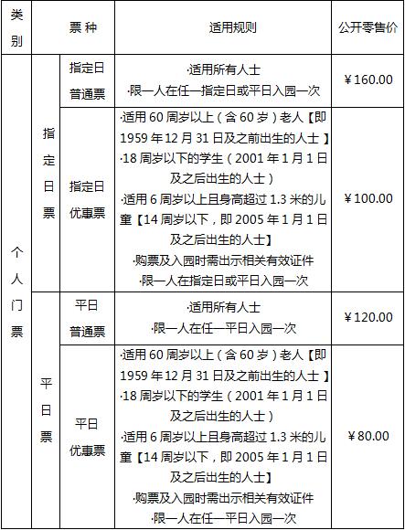 3、指定日票分为指定日普通票和指定日优惠票两种;平日票分为平日普通票和平日优惠票两种。通过线上渠道购买的门票适用规则和门票价格如下表: