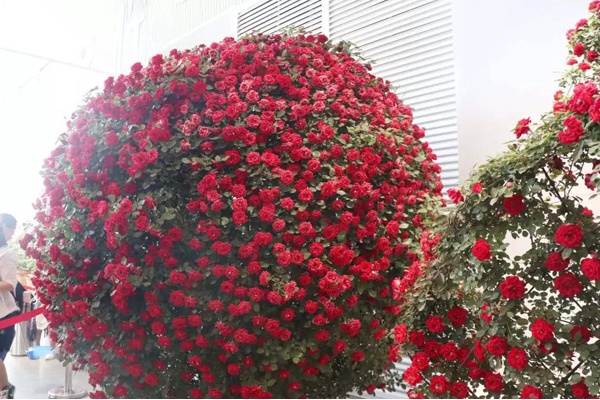 在展区,游客可以看到种类丰富的盆栽月季,新颖现代的造型月季和独具韵味的月季盆景、月季造景。其中,盆栽月季,造型月季新颖现代,月季盆景和月季造景则独具韵味。造型月季的一大亮点是直径2.2米的月季球。据介绍,这是目前世界上最大的月季造型球,是由“小女孩”品种制作完成。