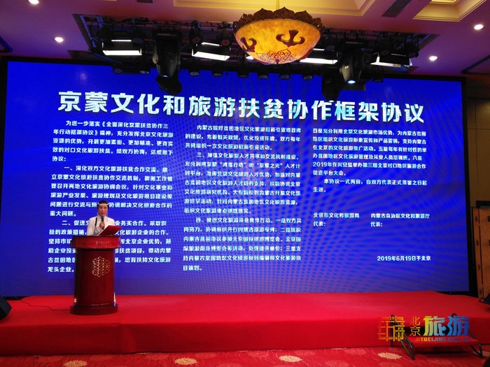 为了推动京蒙文化和旅游扶贫协作迈上新的台阶,全面贯彻落实两地政府签署的《2019年东西部扶贫协作协议》,北京市文化和旅游局和内蒙古自治区文化和旅游厅签署了《京蒙文化和旅游扶贫协作框架协议》,双方将在深化文化旅游扶贫合作交流,建立协作交流机制;促进京蒙文化旅游企业务实合作;与加强文化旅游人才共享和交流;积极协调开行内蒙古旅游专列;组织内蒙古贫困地区免费参加北京旅博会等活动;支持内蒙古贫困地区文化旅游规划编制和文化旅游项目策划;加大内蒙古贫困地区文化旅游形象宣传和产品营销力度;2019年在兴安盟举办第三届北京对口地区旅游合作促进平台大会等方面开展广泛而深入的合作。