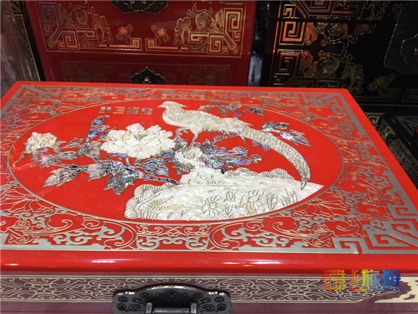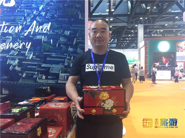 来自山西的雷昕兴先生,这次带来的参展商品是中国四大名漆器之一——平遥推光漆器。推光漆器是一种工艺性质的高级大漆器具,山西平遥地方传统手工技艺之一,以手掌推出光泽而得名。制作工序繁琐,光是刮灰就需要五到六次,而且每次都必须等到刮上去的灰完全干透,才能进行下一次刮灰。用料颇为讲究,使用的是在黄土高原广泛分布着的漆树割掉树皮后流出来的一种天然漆料—大漆。平遥推光漆器外观古朴雅致、闪光发亮,绘饰金碧辉煌,手感细腻滑润,环保无毒抗虫蛀,耐热防潮,经久耐用,被认为是漆器中之精品。雷先生表示,展会期间很多游客前来咨询,对推广平遥推光漆器有很好的宣传作用,希望以后能多来北京参展。