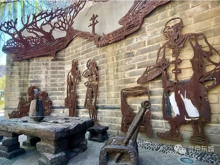 除了赏花,这还有一个“四合院”主题的铜质浮雕《观棋不语》《夏日茶香》《儿时意趣》,喝大碗茶的,滚铁环的,下棋,遛鸟儿的,颇有老北京人儿时的意趣和市井风情。
