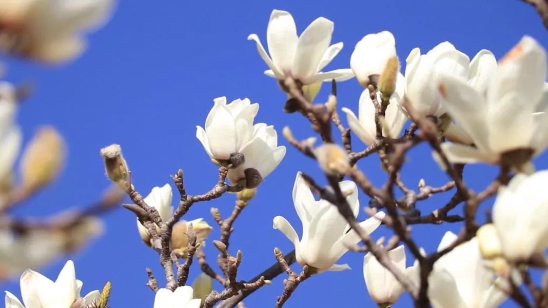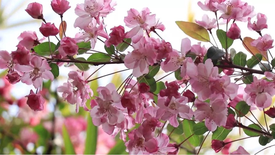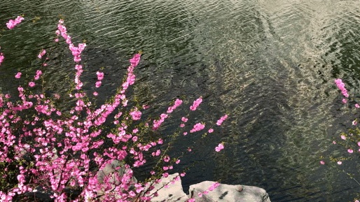 金灿灿的连翘、粉嘟嘟的海棠、皎洁的白玉兰、幽幽淡紫的丁香花……十多种春花此起彼伏绽放,倒映在清亮的护城河水中,仿佛一幅绝美的油画。