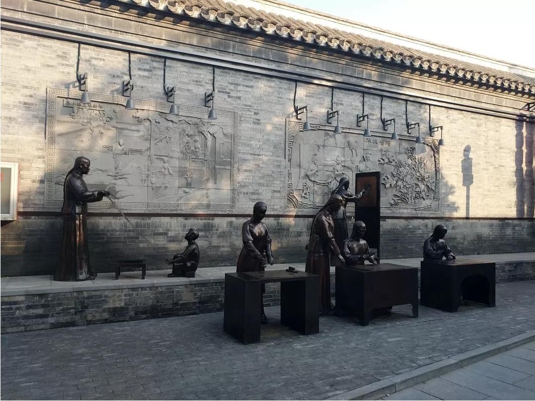在大街上,有着许许多多的铜雕,用各种姿态,展示着当年的样子,或是雕刻木板的工人,或是认真绘画的工匠,惟妙惟肖地展示着当年的样貌。