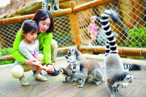 上图:昨天,在北京野生动物园,在饲养员指导下,游客将自己制作的窝头月饼喂给环尾狐猴。本报记者 邓伟摄