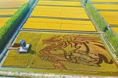 唐山市曹妃甸区四农场金黄色的稻田里,一幅巨型立体稻田画《凤凰涅槃》迎接游客前来观光。近年来,曹妃甸深挖旅游资源,充分利用自然景观打造集“自然、休闲、康乐、销售”为一体的模式,发展体验农业和观光农业相结合的特色旅游。马文晓航拍