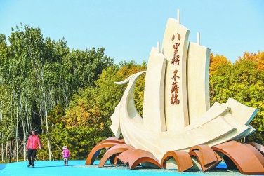 进入八里桥公园南门,举目四望,深秋时节的园子彩叶绚烂,红黄绿紫错杂交织。前行数十步,便是数米高的漕船雕塑,高高撑起的桅杆上,写着“八里桥不落桅”的字样。“这艘船形似凤凰,象征着朝气蓬勃的朝阳区。”朝阳区城管委的钟艳说,船下的蓝色“水波”是塑胶材质的,向四方伸展,贯穿公园,是市民慢跑的好地方。