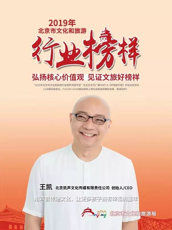 王凯,中国传媒大学广告学院客座教授。他是“凯叔讲故事”品牌创始人,北京凯声文化传媒有限责任公司CEO,创建了“凯叔讲故事APP”及“凯叔讲故事微信公众号”等,被称为新一代“故事大王”。截至目前,“凯叔讲故事APP”累计播出了9000多个儿童故事及内容,累计产出近7000节亲子及儿童教育课程和内容,仅自有APP总播放量达40亿次以上,用户平均日收听时长达到50分钟,总用户超过3000万,被推荐为“孩子的故事大全,亿万父母的育儿宝典”。他通过对声音的精湛演绎和儿童内容的极致打造,以讲故事为介质、以“快乐、成长、穿越”为理念,打造了一系列儿童文化产品,推动了中国传统文化和科学知识在儿童群体中的普及。