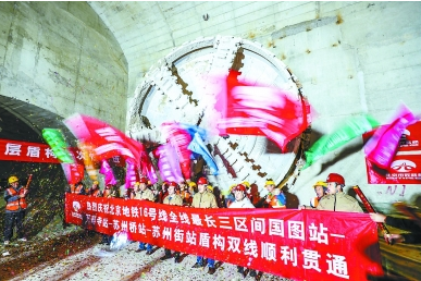 本报讯(记者潘福达)“通啦!”盾构机缓缓破土而出,十多名工人挥舞着彩旗欢呼呐喊,几位小伙子还激动地拥抱庆祝。从16号线国图站始发的这台盾构机已连续掘进4262米,经过万寿寺站和苏州桥站后,终于平安抵达苏州街站盾构接收通道。