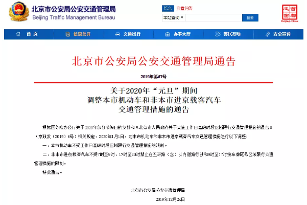 关于2020年“元旦”期间调整本市机动车和非本市进京载客汽车交通管理措施的通告