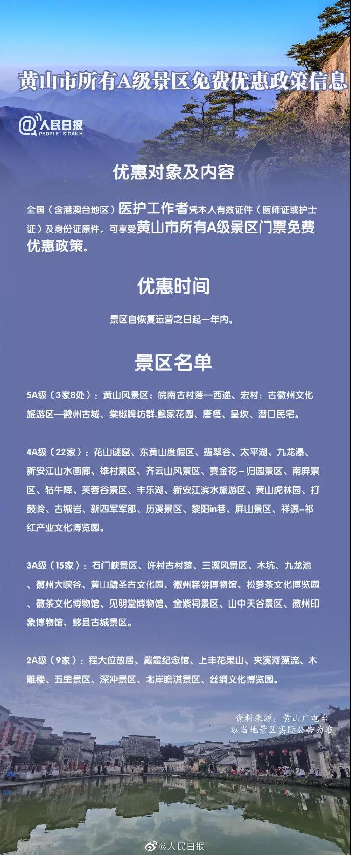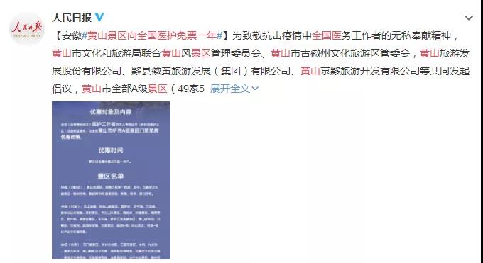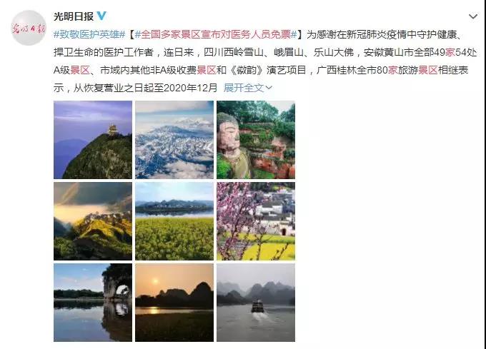 其实,为了致敬最美逆行者,不仅仅是安徽黄山,全国多家景区也都先后出台了相关政策:自恢复运营之日起一年内,对全国医护工作者实行门票免费优惠政策~