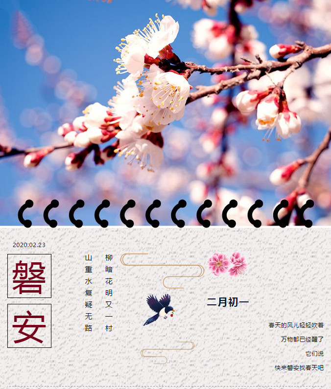 2020年的开场让人触手不及,唯有季节仍然不紧不慢的走着,二月了,处处都是早春的声音,春水解冻,桃花吐蕊,暖风轻抚,细雨浸润。春天,还是那个春天。