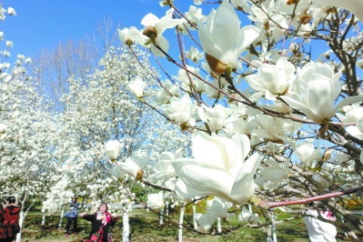 京城玉兰数量最多、品种最新、颜色最全、花期最长的莫过于石景山北京国际雕塑公园“玉兰花苑”。这里种有5000余株玉兰,目前已陆续开放,包括最新引进的苏珊、安妮、简爱、进口天女木兰等新优品种,为京城再添一抹春色。