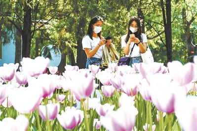 春暖花开,北京中山公园郁金香陆续开放,吸引市民游客前来踏青赏花。