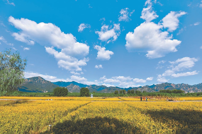 顺着骑游绿道来到阪泉体育公园西北端,眼前是一大片金黄的稻田。秋风吹拂,稻香阵阵,一条木栈道在稻田中蜿蜒,仿佛与远山相接,美不胜收。