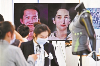 北京青年报记者在展区内看到,一面25米长的主视觉弧度墙面,投放视频内容的主题是“北京”,从北京中轴线到市井民生,从传统文化到现代科技,北京的丰富层次被体现得淋漓尽致;由四组半透明全息纱屏幕和点状布局的模型塑造了整个空间的“丛林”感,关于城市、建筑、科技和艺术的信息充满丛林,也暗示了这四个主题之间的关系是交织与融和;地面铺地着重突出了北京的十字轴线,以及规划中的重点——核心区和城市副中心;代表着北京近期最重要的建筑成就之一的北京大兴国际机场,则用两个灯光装置进行了艺术化的表达。