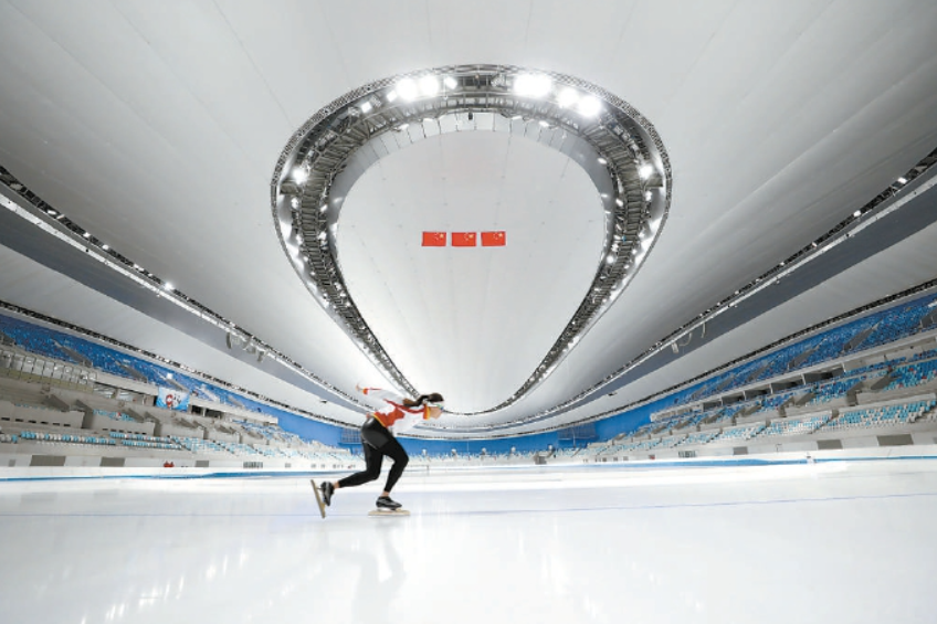 国家速滑馆冰面面积1.2万平方米,通过分模块控制单元,可以根据不同项目分区域、分标准进行制冰,既能满足冬奥会速度滑冰比赛使用要求,还可以根据不同冰上项目对冰面的使用需求分区域制冰。