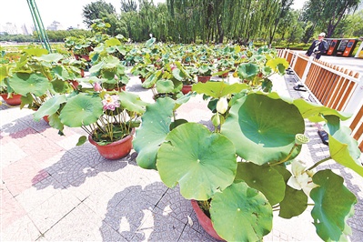 今年莲花池公园在15万平方米的水面上开辟了6处荷花荡区,并在广场等主要区域栽摆有5000余盆形态各异的荷花。在公园东、北广场分别设置睡莲观赏区。睡莲有万维莎、科罗拉多、黄乔伊、霞光万道、诱惑、圣女白等品种,颜色鲜艳夺目。