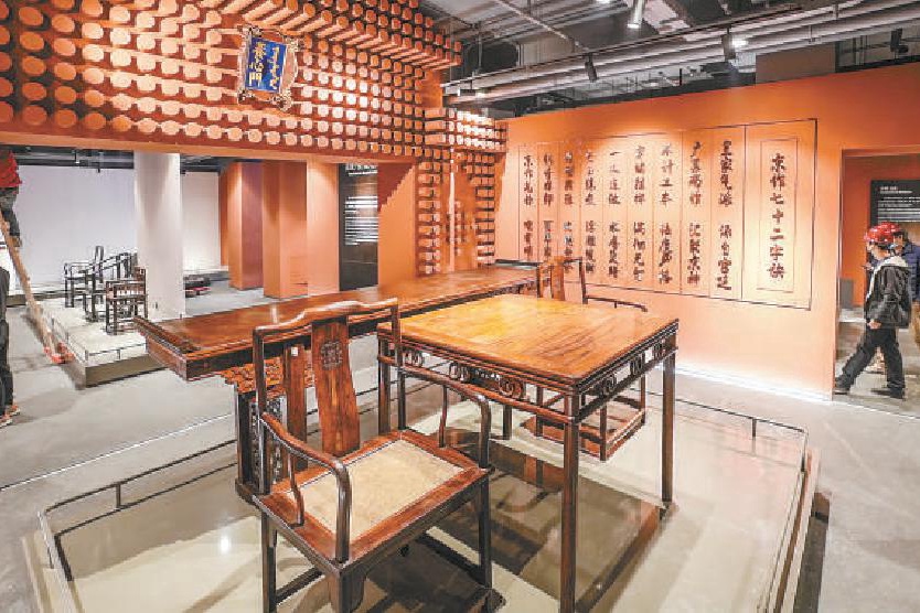 来到京作文化园门口,古色古香的牌坊上“龙顺成”三个大字格外醒目。园区内,工人们正在忙碌着装修作业。博物馆外立面为宫墙红色,装饰风格源自宫廷宝匣,呈现出硬木肌理的纹样。馆内共有两层空间,展览采用声光电等多媒体形式,展示了京作家具非物质文化遗产的相关历史。馆内陈列了大批明清时期的硬木家具,将在北京冬奥会上投用的部分家具也一并亮相。