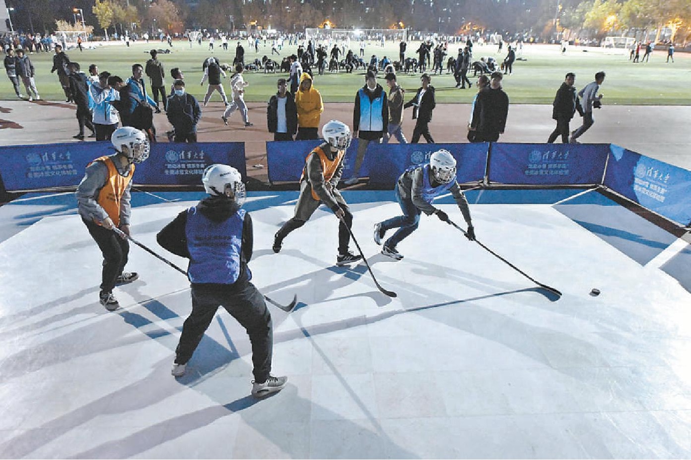 昨天,“燃动冰雪·情系冬奥”冬奥冰雪文化体验营活动在清华大学紫荆操场举行。大学生们在冬奥志愿者的引导下体验冰球对抗、陆地冰壶和冰蹴球等竞技类冰雪项目,活动在普及冬奥知识、推广冰雪运动的同时,营造了浓厚的校园冬奥氛围。