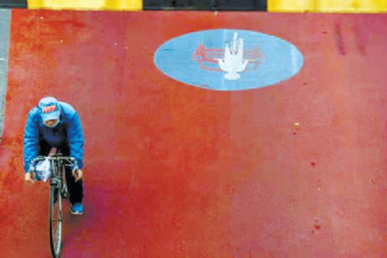 在东直门桥,一条机动车道和一条非机动车道逐渐汇成一条红色铺装道,道路正中印着一个标志,骑车人图案在前,汽车图案在后。“这个标志的意思是,这段路机动车也可通行,但骑行人路权优先。”该负责人说,改造前,立交桥下慢行道只有1.5米宽,改造后慢行道宽度变为3米左右,提高了通行能力和舒适性。